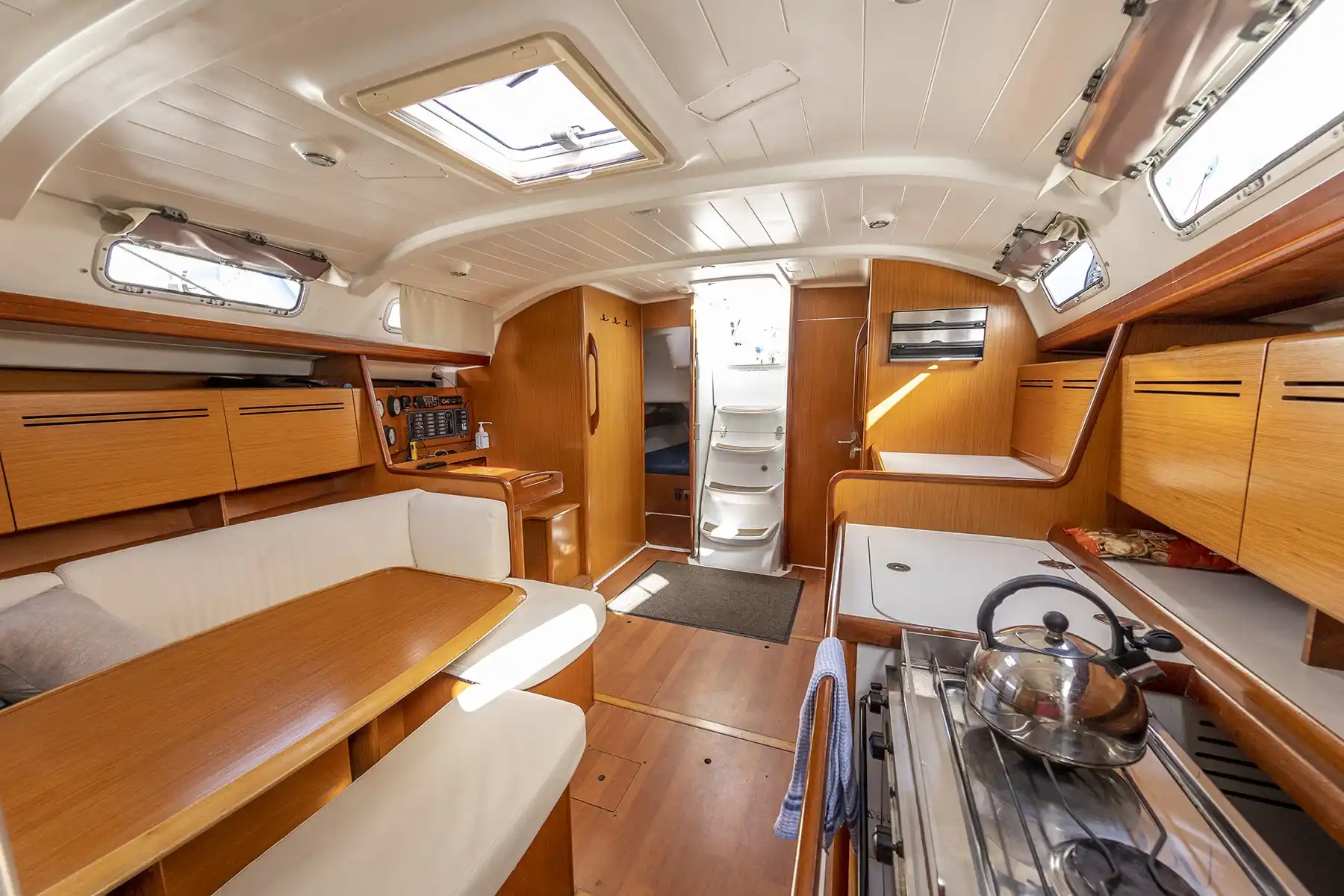 Комфортная парусная яхта со всеми удобствами на борту. Просторный кокпит и кают-компания, полностью оборудованная всем необходимым кухня, три каюты с двуспальной кроватью и шкафчиками, санузел с душем и горячей водой. Количество человек в походе: 6 + капитан.